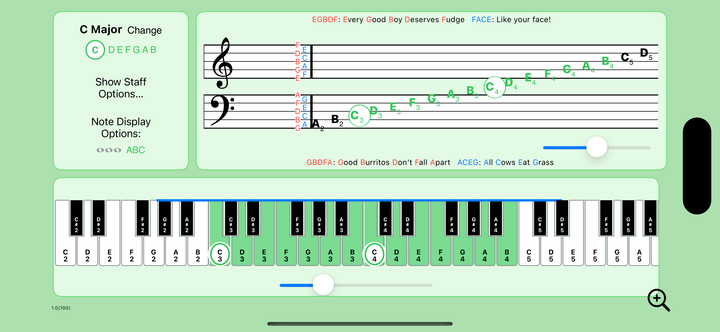 Learn Your Keys is a simple app that does one thing–help you learn your keys by showing their notes on a staff and a piano keyboard.